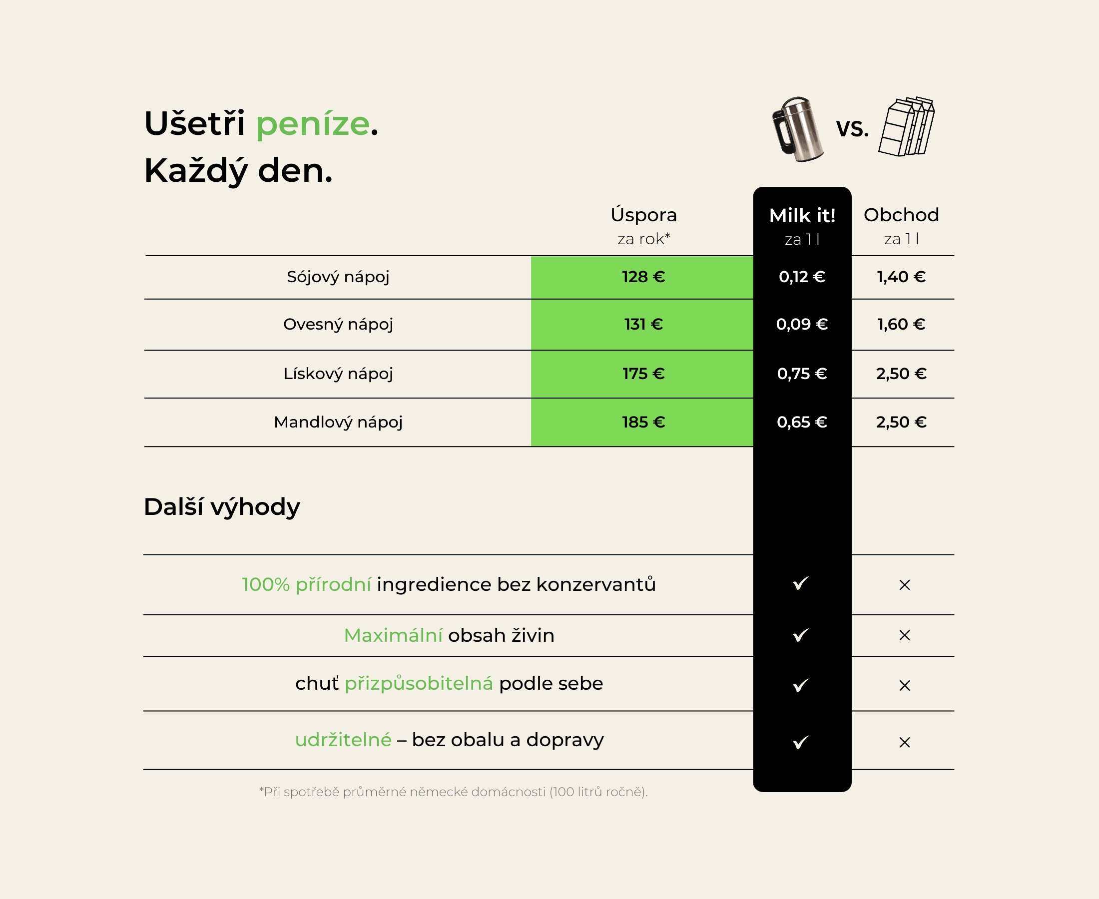 Každý rok způsobí přeprava rostlinných nápojů přes 200 000 tun CO₂—a k tomu odpad z obalů a spotřeba vody. S Milk it! si nápoj připravíš doma, bez jednorázového odpadu a dlouhých přepravních tras. Udržitelné, jednoduché a šetrné k přírodě!