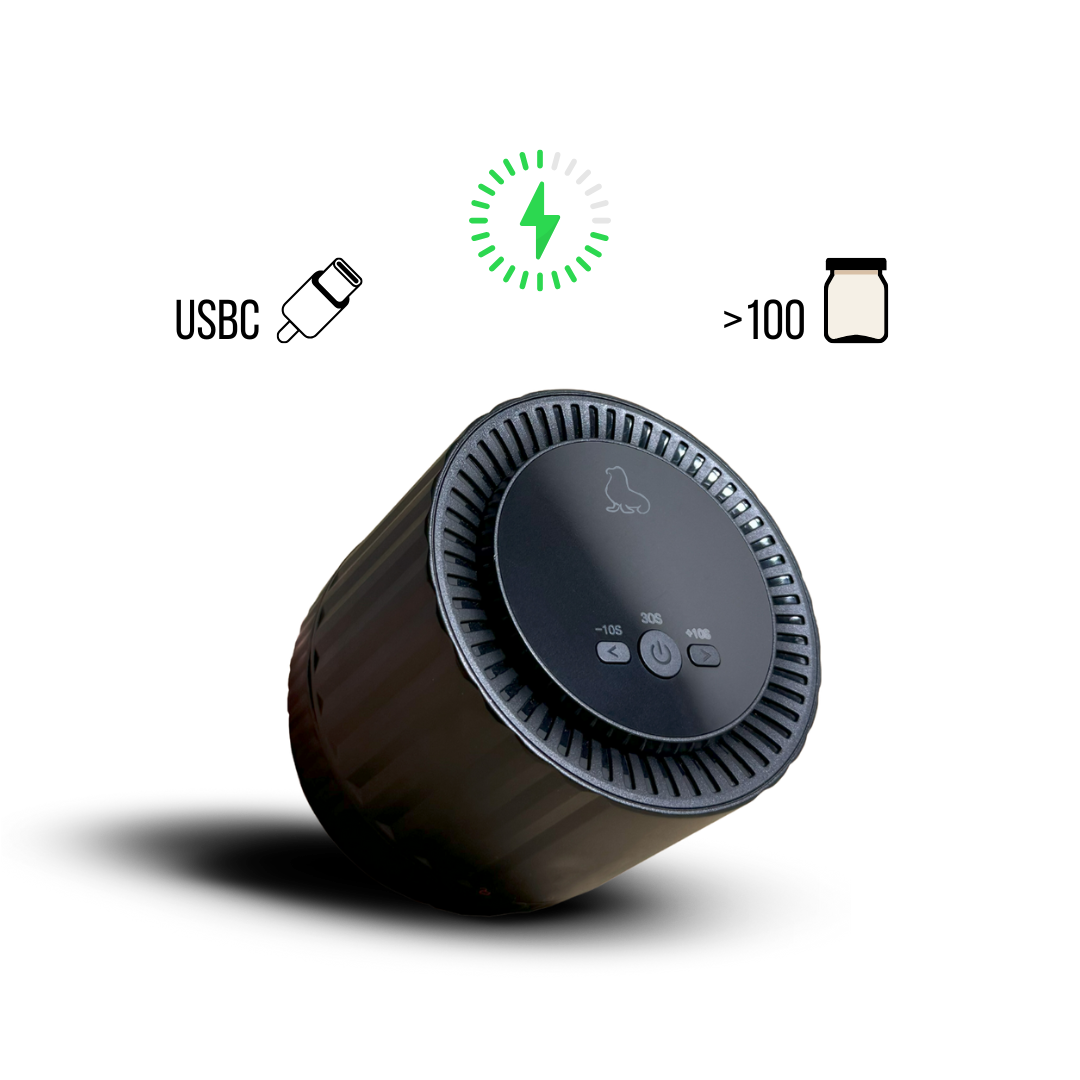 Unser EcoSeal Pro ist nicht nur umweltfreundlich, sondern auch hocheffizient! Dank des leistungsstarken USB-C-Anschlusses lassen sich mit einer kurzen Ladung mühelos 100 Gläser versiegeln. Wenn dir frische Lebensmittel auch so wichtig sind wie uns, ist der EcoSeal Pro mit Sicherheit dein optimaler Küchenbegleiter.