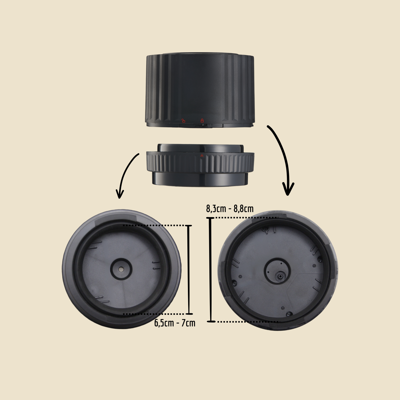 Auch wenn der EcoSeal Pro primär auf unsere Vaku-Gläser und Mason Jars abgestimmt ist, funktioniert er dank des beiliegenden Adapters oft auch mit anderen runden Einmachgläsern mit Öffnungsdurchmesser von 6,5-7 cm und 8,3-8,8 cm und einem Glashals/einer Glasschulter mit gleichen oder größeren Dimensionen.